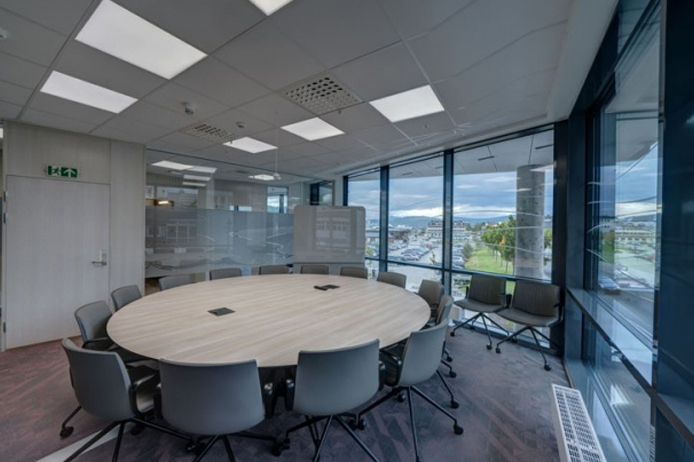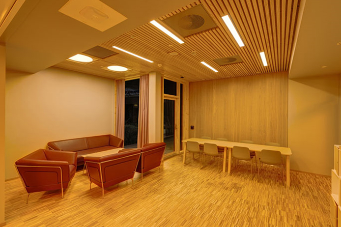 The lighting system in the team rooms for the 36 employees are pre-set according to a fixed day cycle. In the morning when the staff arrive at work, the lighting is warm white. After a while the lighting shifts to cold white and lighting intensity is increased to 800 lux, before it is lowered again, and turning warmer towards lunchtime. After lunch the blue-white tones increase again, before they decline towards the end of the day, and the warm white light becomes more prominent. In the meeting and quiet rooms it is possible to adjust the light in three categories – normal lighting (4000 kelvin, 500 lux), calm lighting (3000 kelvin, 500 lux) and focus lighting (6000 kelvin, 800 lux), as required.